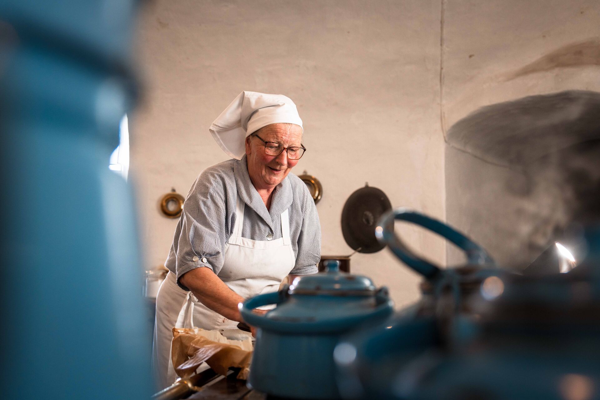 Forkæl dig selv med kaffe og hjemmebagt kage i Gammel Estrups autentiske herregårdskøkken — indrettet som for 100 år siden med det gamle brændekomfur og originale opskrifter. Måske møder du endda husjomfruen og køkkenpigerne, som serverer kaffe fra den store Madam Blå-kande.