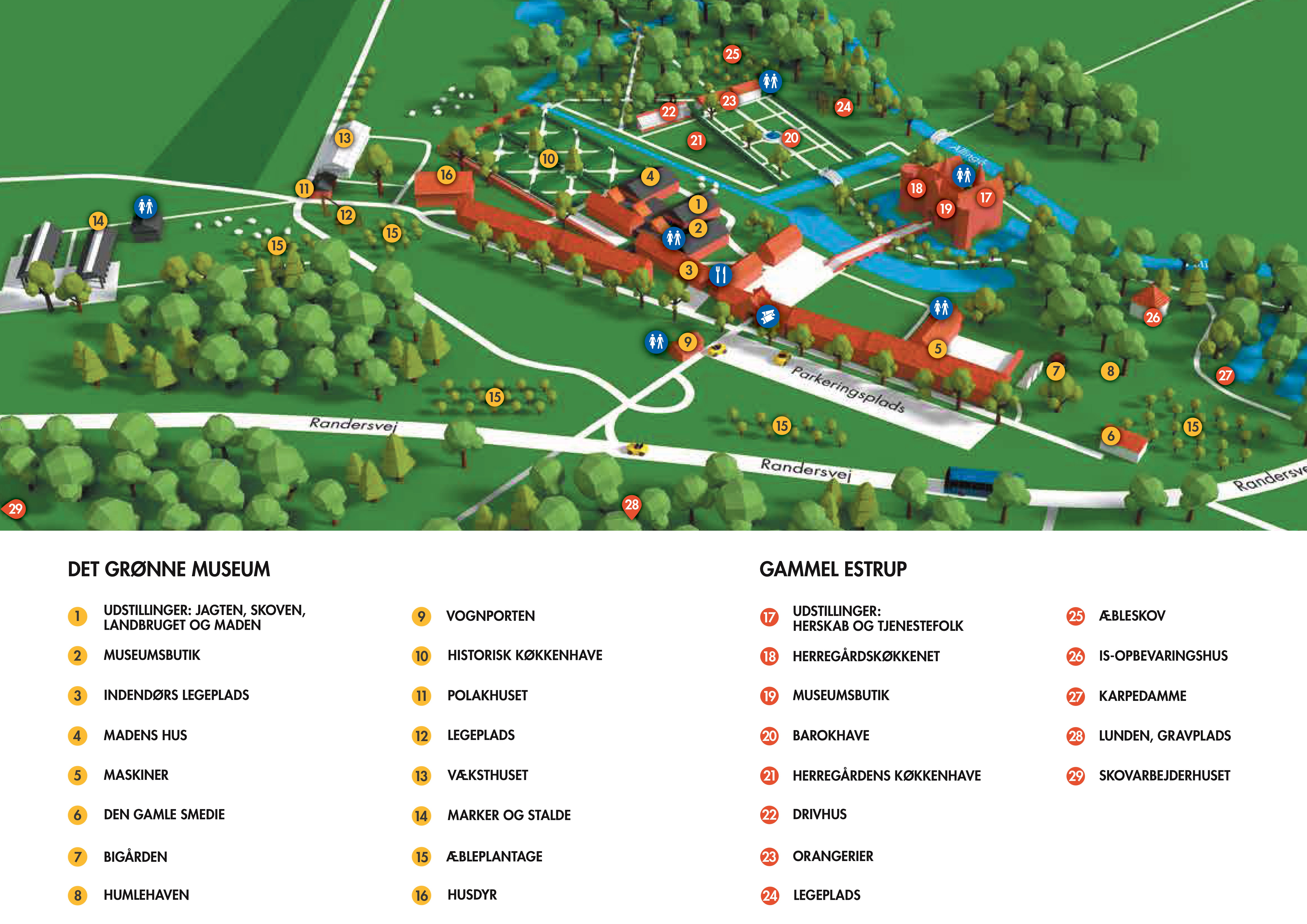 Gammel Estrup Danmarks Herregårdsmuseum og Det Grønne Museum ligger lige ved siden af hinanden. Det samlede museumsområde er stort, og man bør påregne flere timer, hvis man vil se det hele.