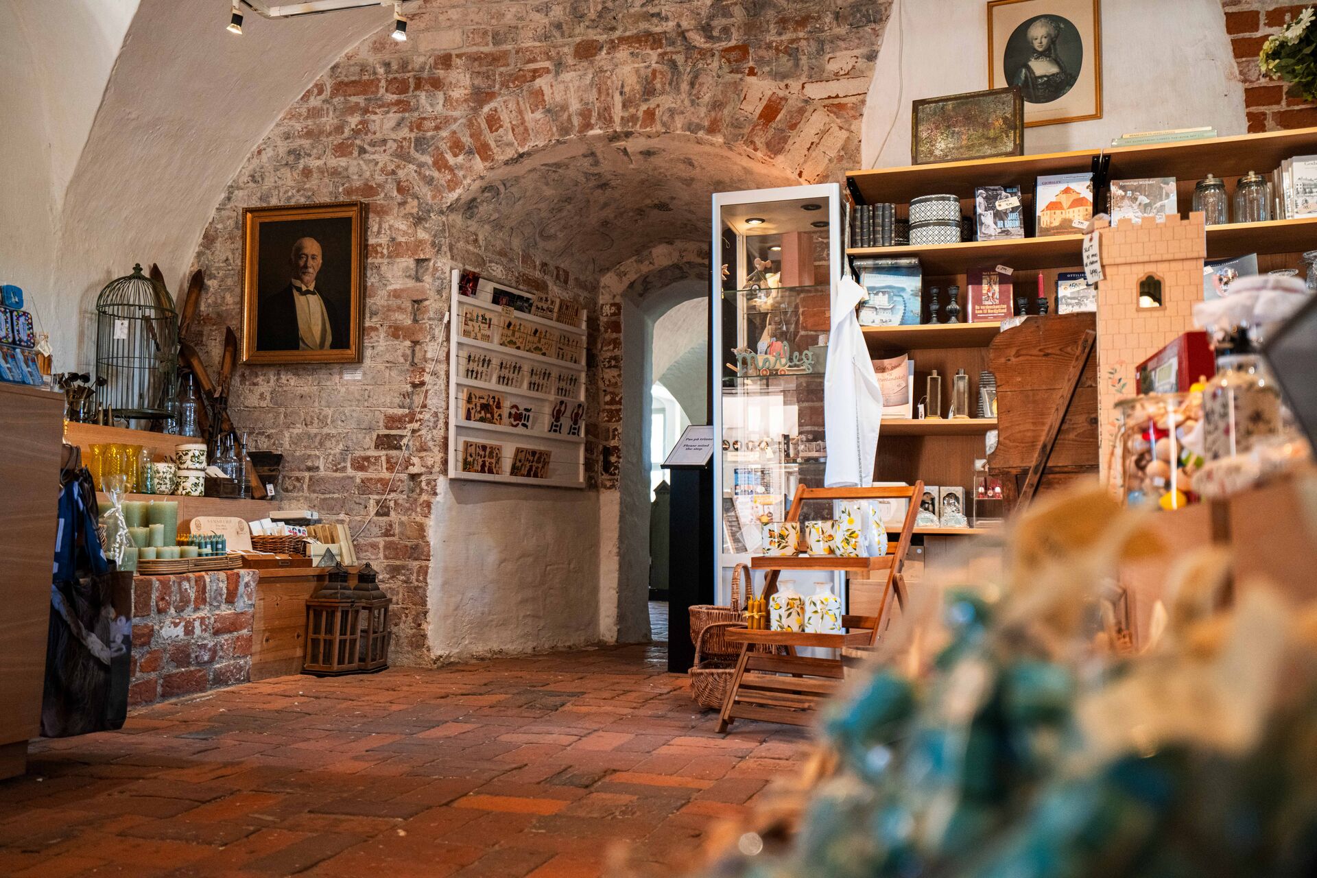 Butikken er en direkte forlængelse af udstillingen og ligger inde i selve herregårdens ældste fløj, hvor man stadig kan fornemme middelalderens forsvarsværk med de tykke mure og hvælvede lofter. Indgangen til butikken findes i porten.