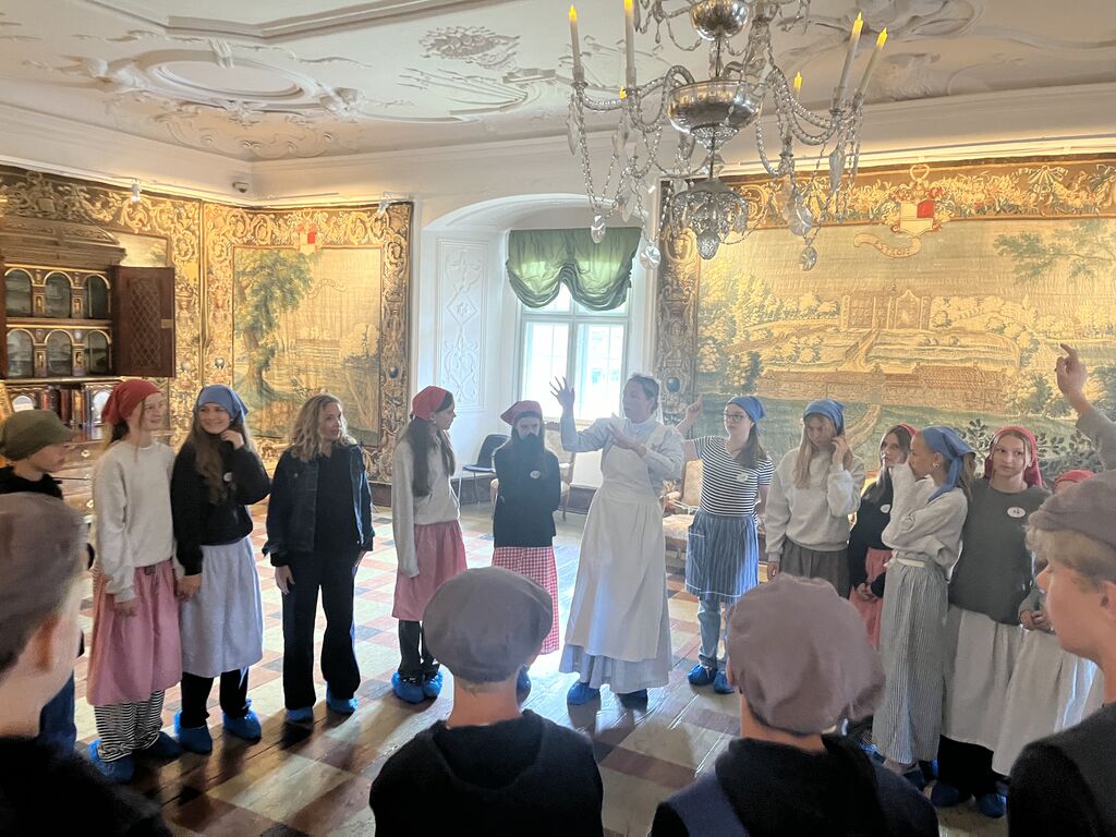 En formidler, udklædt som tjenesteperson, tager imod eleverne, der præsenteres for forskellige livsfortællinger og kulturelle fællesskaber igennem tjenestefolkenes historier. Vi taler om, hvad der er retfærdigt og uretfærdigt, og hvad der er lige og ulige, og begynder med et rollespil. Igennem blandt andet udklædning, skaber eleverne deres egen tjenesteperson, og udtrykker sig igennem kreative og skriftlige øvelser i deres egen skudsmålsbog. De skal også pakke en kuffert, så de er klar til at flytte ind på herregården og herigennem forholde sig empatisk til historiske personers valg og livsvilkår. Vi bruger stedvist mobiltelefoner i undervisningen hvis det er muligt, så medbring dem gerne.